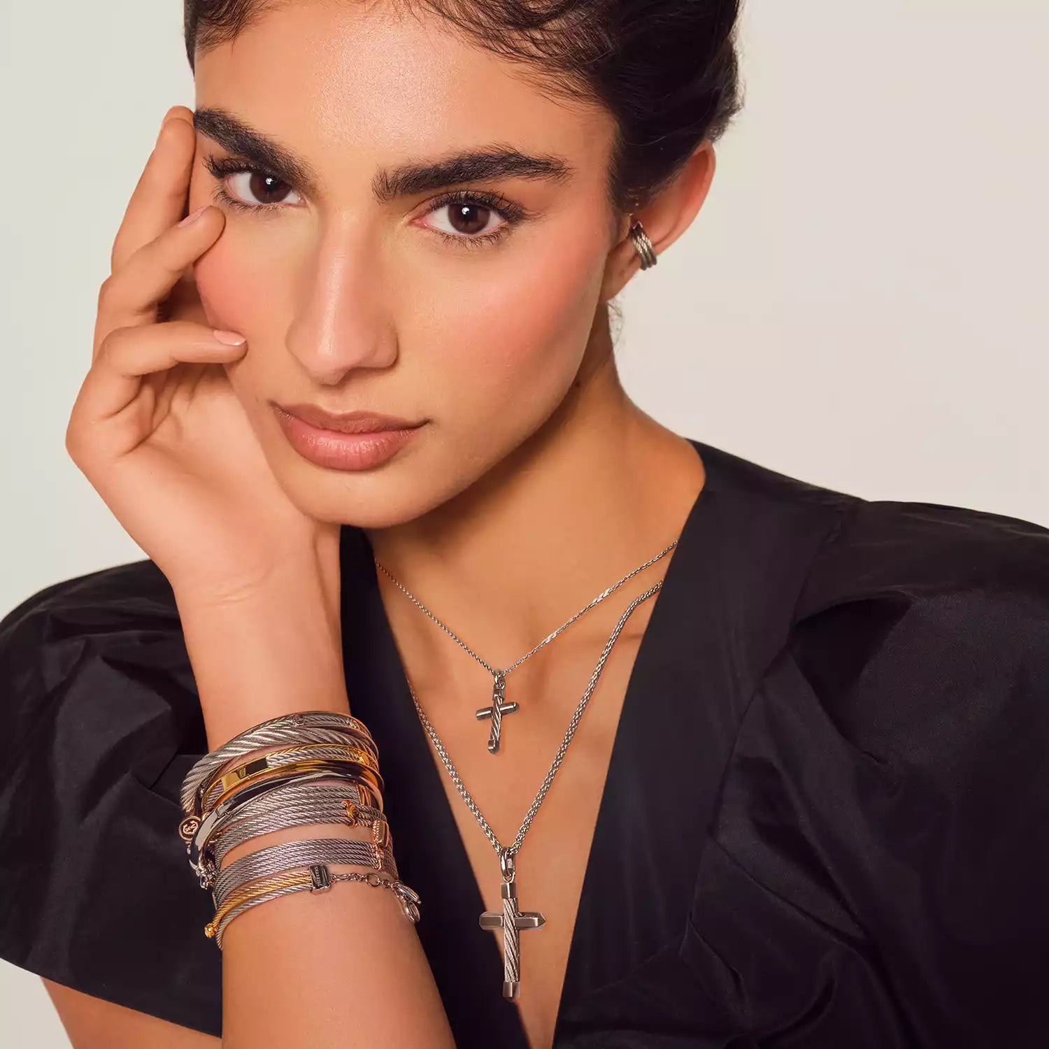 Tuklasin ang walang hanggang karangyaan at malalim na simbolismo ng aming pinakabagong Charriol paglikha: ang Celtic Cross Necklace. Na infused sa Celtic pamana at ang kontemporaryong pinoy kasingkahulugan ng Charriol tatak, ang kuwintas na ito ay naglalaman ng perpektong pagsasanib ng tradisyon at pagiging makabago. Ang bawat krus, meticulously crafted sa Yellow Gold PVD o hindi kinakalawang na asero, ay nagdadala sa loob nito ang kakanyahan ng Celtic tradisyon, na nagbubunyag ng pinong detalyadong pagkayari at sopistikadong aesthetics. Kung sa marangyang gleam ng dilaw na ginto o ang walang hanggang katatagan ng bakal, ang bawat materyal ay nag aalok ng isang natatanging pa rin kaakit akit. Nagtatampok ang kuwintas ng dalawang magkaibang palawit, na nagdaragdag ng isang ugnay ng maraming nalalaman sa iyong estilo. Kung pinili mong magsuot ng parehong mga pendants magkasama para sa isang matapang na pahayag o hiwalay para sa understated elegance, ang kuwintas na ito ay umaangkop sa bawat okasyon at bawat hitsura. Isuot ang Celtic Cross Necklace na may pagmamalaki, pagkuha ng diwa ng Celtic tradisyon habang embodying ang iyong sariling natatanging estilo at personalidad. Hayaan ang iyong sarili na madadala ng sinaunang kasaysayan at walang hanggang kagandahan ng pambihirang piraso na ito, na idinisenyo upang samahan ka ng kagandahan sa bawat sandali ng iyong buhay.